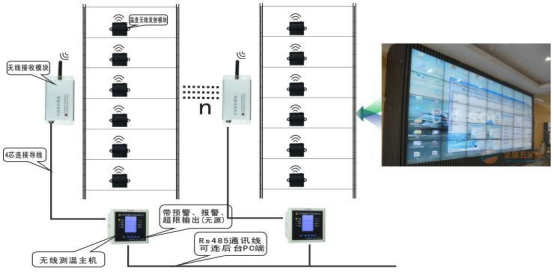 針對(duì)此類問(wèn)題,我公司提供了一套切實(shí)可行的解決問(wèn)題的方案。采用一線制溫度傳感器與無(wú)線溫度傳感混合使用,同時(shí)配合環(huán)境濕度傳感器,對(duì)液晶幕墻或者DPL 大屏幕提供周全的溫濕度環(huán)境監(jiān)控,提供輸出控制接口。通過(guò)測(cè)點(diǎn)溫度在線監(jiān)測(cè),及時(shí)發(fā)現(xiàn)故障點(diǎn),控制相關(guān)設(shè)備運(yùn)行狀態(tài),并就異常進(jìn)行告警記錄,便于對(duì)設(shè)備進(jìn)行狀態(tài)維修,為確保系統(tǒng)可靠運(yùn)行提供了一種手段。