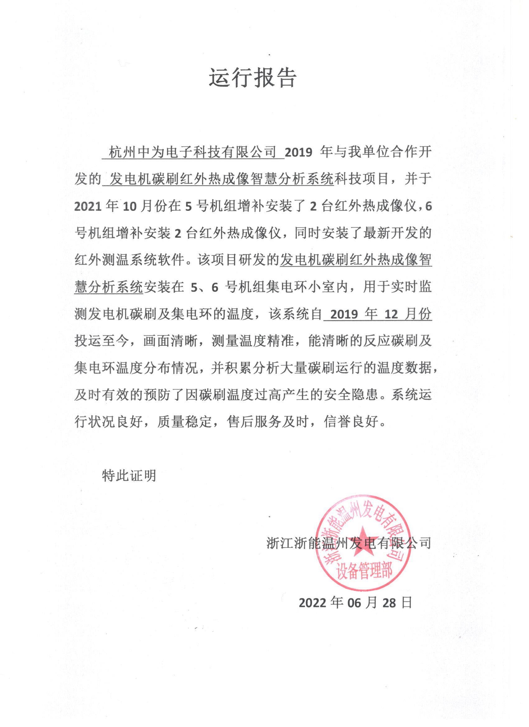 浙江浙能溫州發(fā)電有限公司5、6號機組加裝發(fā)電機碳刷紅外熱成像智慧分析系統
