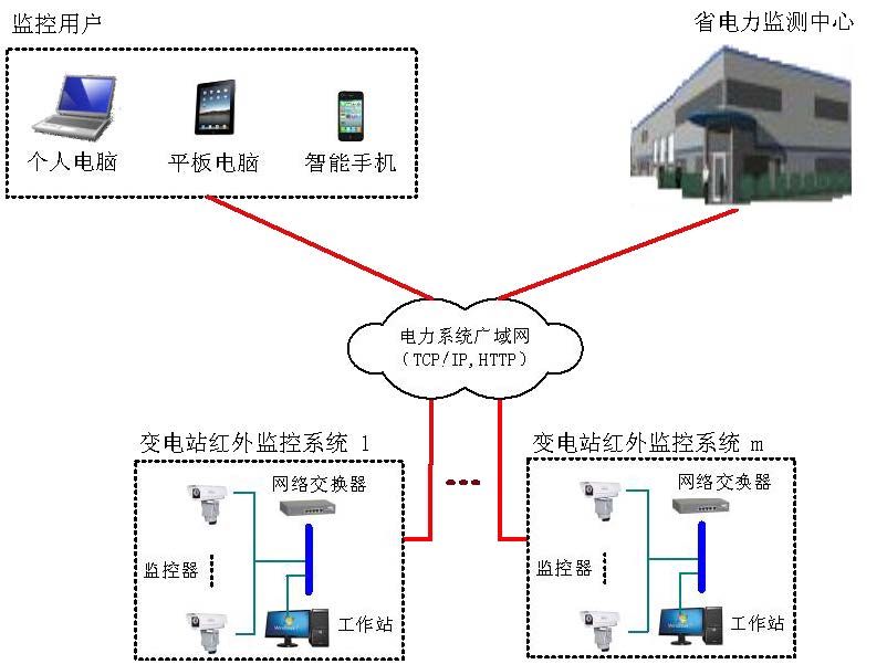 基于紅外熱成像的電力變電站遠(yuǎn)程監(jiān)控系統(tǒng)由全天候高性能雙通路監(jiān)控頭(紅外熱成像+CCD)與相應(yīng)的計(jì)算機(jī)網(wǎng)絡(luò)組成,系統(tǒng)采用了先進(jìn)的計(jì)算機(jī)壓縮技術(shù)與網(wǎng)絡(luò)傳輸技術(shù),只需通過RJ45標(biāo)準(zhǔn)以太網(wǎng)通訊接口,僅用“一根網(wǎng)線,一個(gè)IP地址”就可實(shí)現(xiàn)遠(yuǎn)程對(duì)雙視監(jiān)測(cè)器控制(焦距、溫度校正)、傳輸紅外和可見光視頻、傳輸測(cè)溫?cái)?shù)據(jù)、控制云臺(tái)。