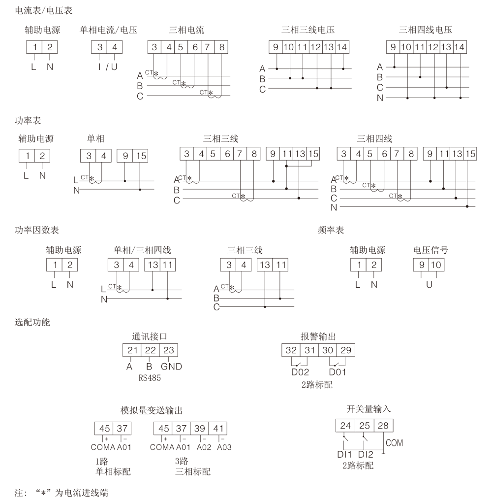RS485通訊,“MC”代表同時帶“M”模擬量輸出和“C”RS485通訊,“KC”“JC”“JM”“JMC”同理 。